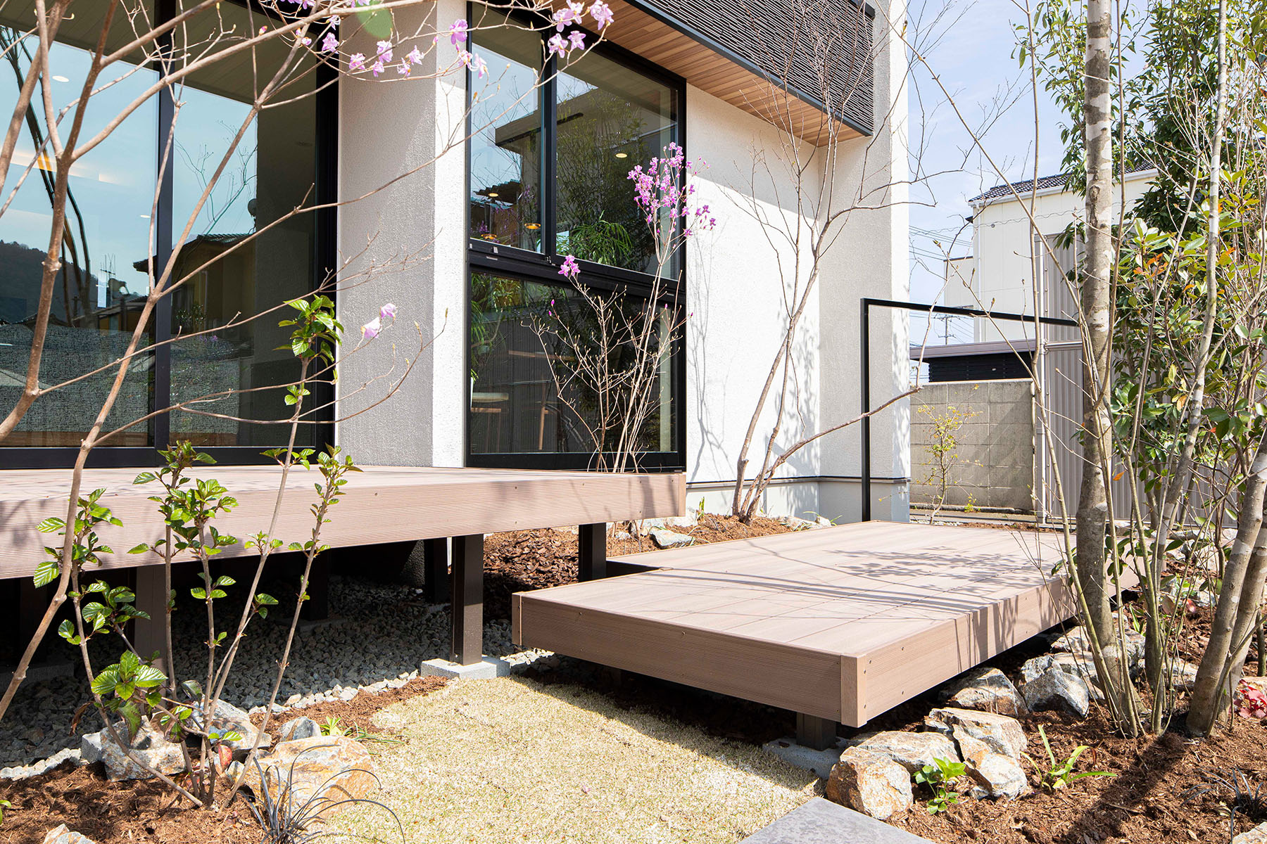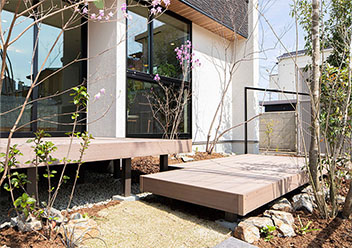 緑豊かな庭に、広々とくつろげるウッドデッキ。 リビングからフラットに移動が出来て、 くつろぎの空間はさらに広がっていく。