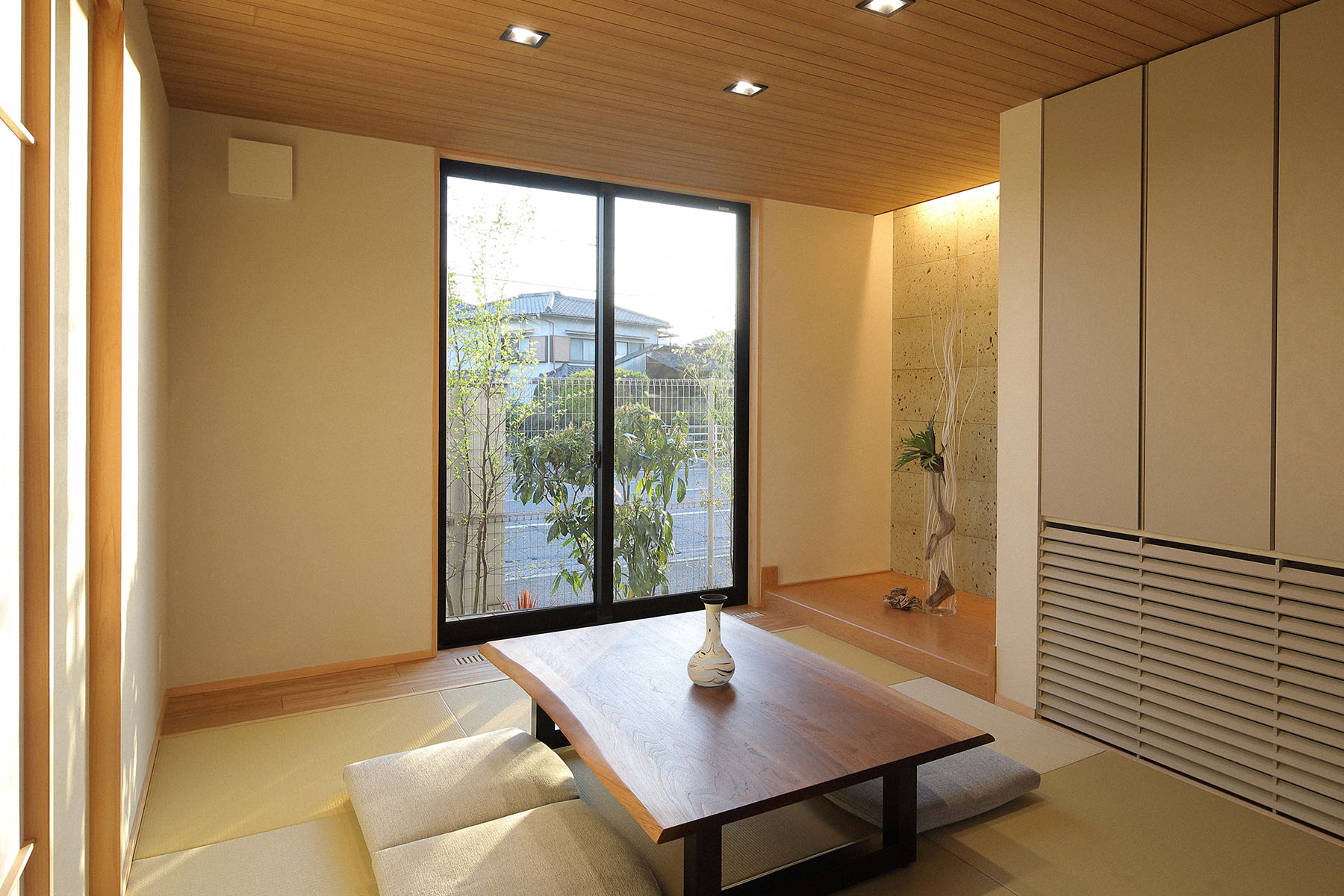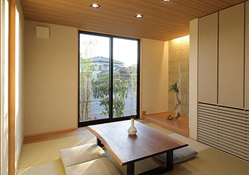 深みのある木の風合いが、 落ち着きを演出するモダンスタイル。 大きな窓から入る日差しで、 明るく開放的な空間。