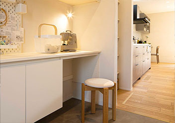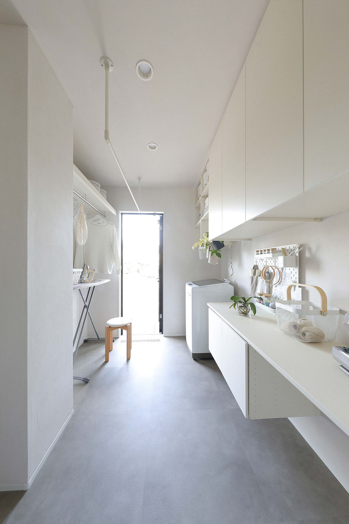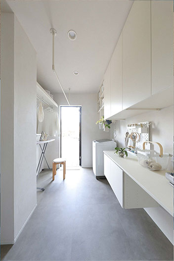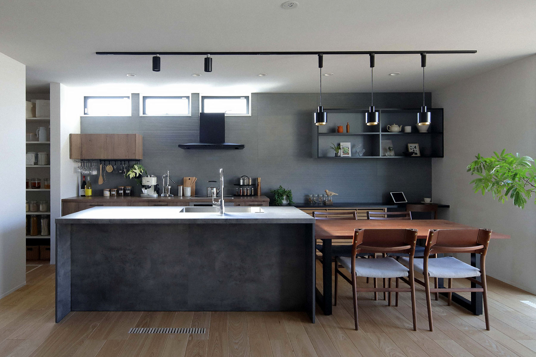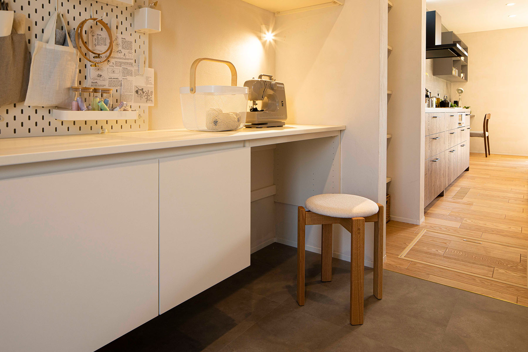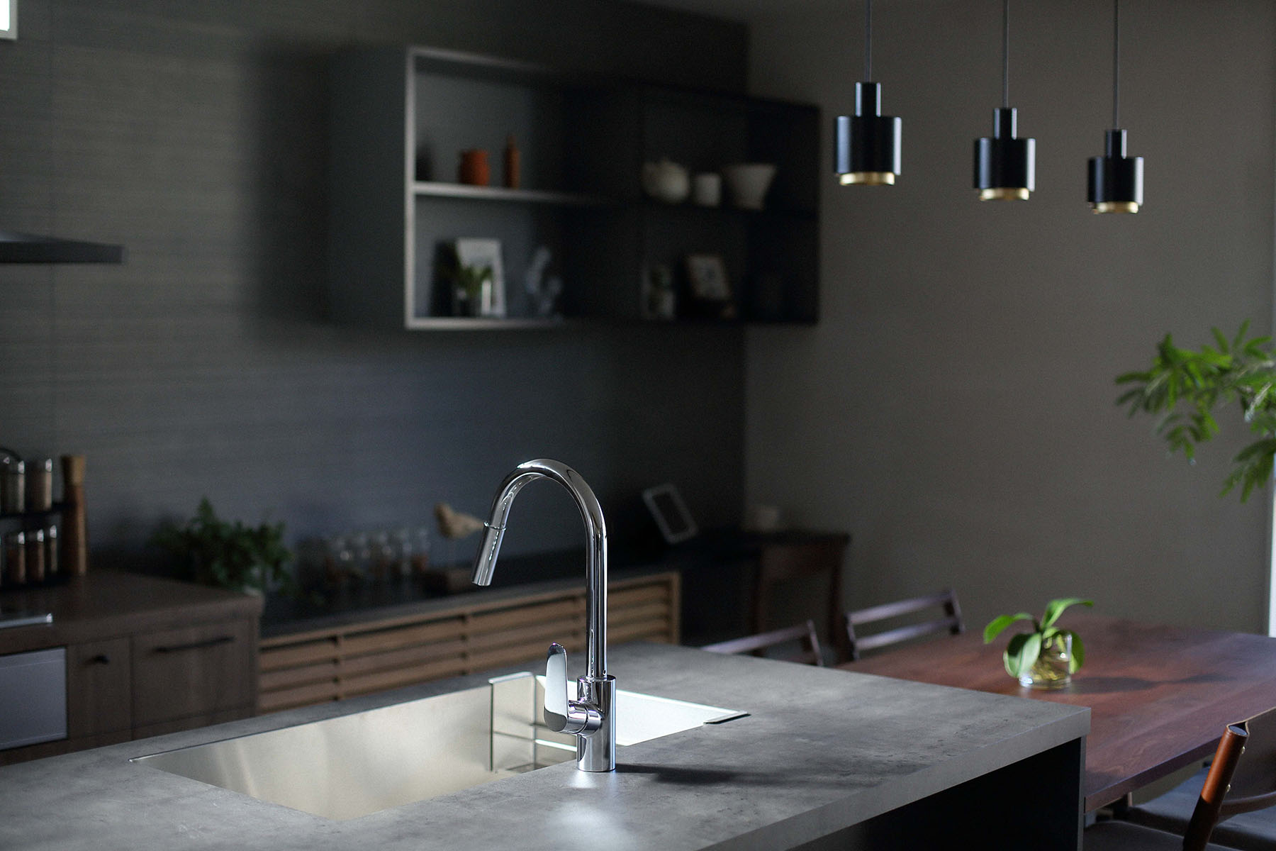 手元が広く作業しやすいように、 アイランドキッチンの背面に コンロがあるII型タイプキッチンを配置。 パントリーからつづくランドリールームへの導線など、 使い勝手をとことん追求したキッチン。
